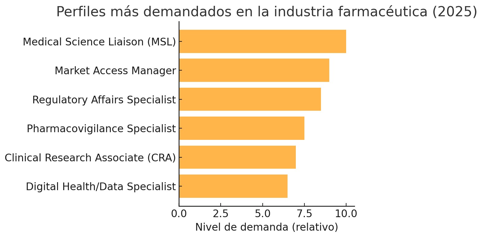 Las empresas valoran especialmente competencias como: conocimiento científico y clínico, orientación comercial, dominio de inglés, y habilidades de comunicación y gestión de proyectos.